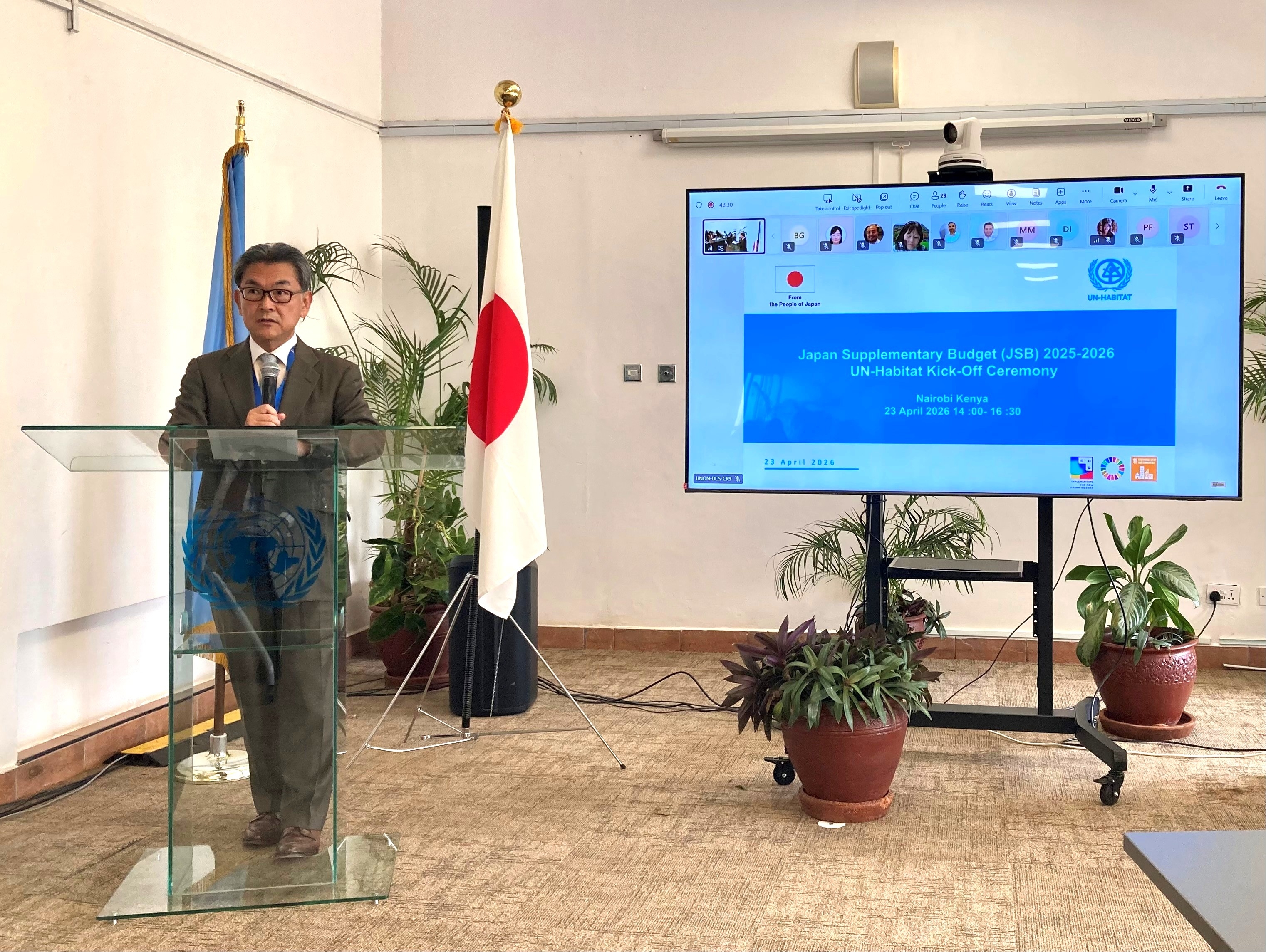 On 23 April, H.E. Mr. MATSUURA, Permanent Representative of Japan, attended the United Nations Human Settlements Programme (UN-Habitat) Kick-Off Ceremony for the projects funded by the Japan Supplementary Budget 2025-2026 which was held at the United Nations Office in Nairobi. The Government of Japan will support nine projects through this supplementary budget (approximately 7.7 million US dollars in total) aimed at improving the living conditions of the urban or rural communities in 11 countries. All of these projects are consistent with “human security,” Japan’s guiding principle for development.